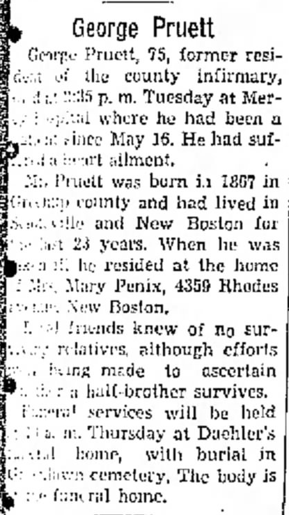 “Mr. Pruett was born in 1867 in Greenup county and had lived in Sciotoville and New Boston for the last 23 years. When he was not ill he resided at the home of Mrs. Mary Penix, 4359 Rhodes avenue, New Boston.”