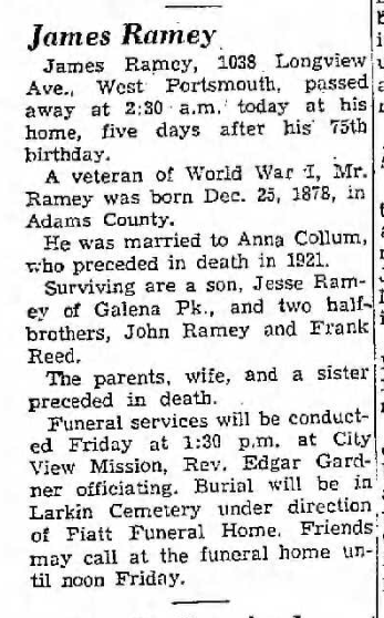“James Ramey, 1038 Longview Avenue, West Portsmouth, passed away at 2:30 AM today at his home, five days after his 75th birthday.”