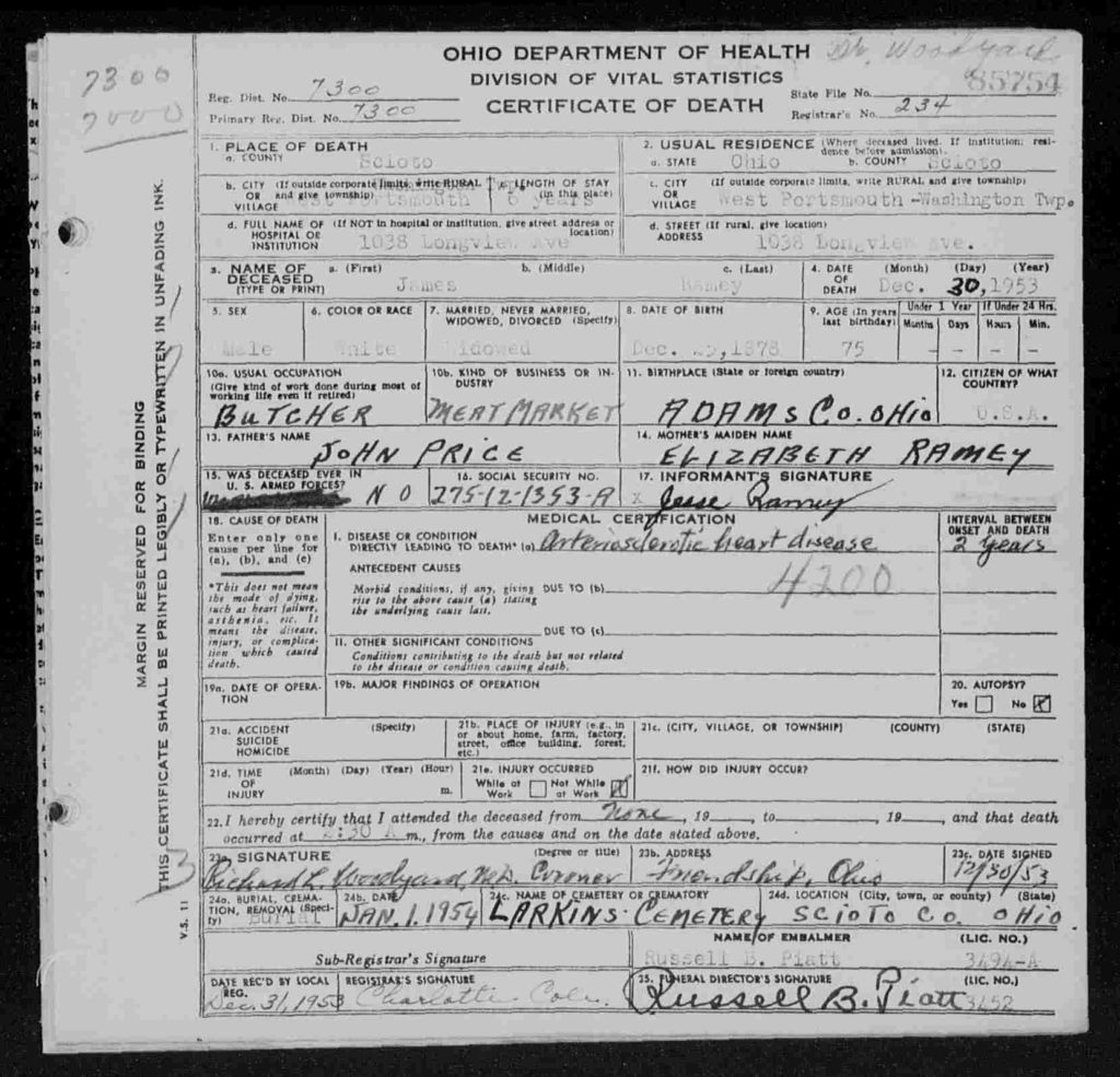 The above certificate of death for James Ramey was registered on December 31, 1953, in Scioto County, Ohio. Interestingly the certificate names John Price as the father and Elizabeth Ramey as the mother.