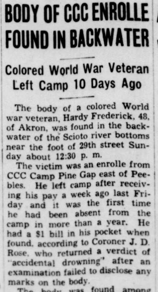 “The body of a colored World war veteran, Hardy Frederick, 48, of Akron, was found in the backwater of the Scioto river bottoms near the foot of 29th street Sunday about 12:30 PM.”