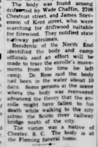 “Residents of the North End identified the body and camp officials said an effort will be made to trace the enrollee’s movements from the time he left the camp. Dr. Rose said the body had been in the water about 10 days. Some persons at the scene where the body was recovered advanced the theory that the enrollee might have fallen to his death while walking to the city across the Scioto river railway bridge north of the city.”