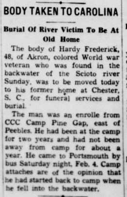“The body of Hardy Frederick, 48, of Akron, colored World war veteran who was found in the backwater of the Scioto river Sunday, was to be moved to his former home at Chester, South Carolina, for funeral services and burial.”