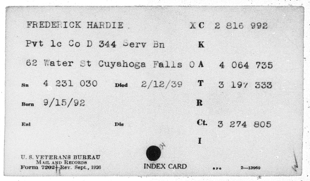 - “United States, Veterans Administration Master Index, 1917-1940,” database, FamilySearch (https://www.familysearch.org/ark:/61903/1:1:QP5L-2KFF : 3 September 2021), Hardie Frederick, ; citing Military Service, NARA microfilm publication 76193916 (St. Louis: National Archives and Records Administration, 1985), various roll numbers.