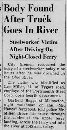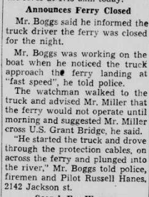 “Garfield Boggs of Maloneton, night watchman on the ‘Mr. Hanes’ ferryboat, told police Mr. Miller drove his truck through the cables at the upper ferry landing, across the ferry and into the river at 1: 45 AM today.”