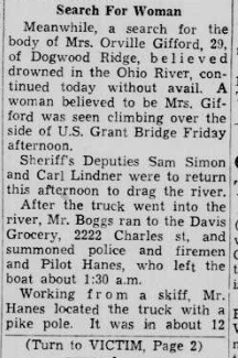 “Meanwhile, a search for the body of Mrs. Orville Gifford1, 28, of Dogwood Ridge, believed drowned in the Ohio River, continued today without avail. A woman believed to be Mrs. Gifford was seen climbing over the side of US Grant Bridge Friday afternoon.”