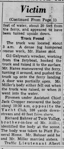 “Gil Galyean’s wrecker, working from the ferryboat, hooked the truck and raised it to the surface. Mr. Hanes maneuvered the ferry, turning it around, and pushed the truck up onto the ferry landing. A door was partially open. Mr. Miller’s body either fell out when the truck was raised, or when it went into the water.”