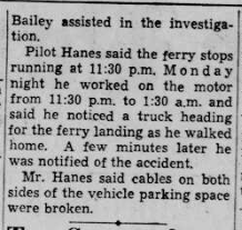 “Pilot Hanes said the ferry stops running at 11:30 PM. Monday night he worked on the motor from 11:30 PM to 1:30 AM and said he noticed a truck heading for the ferry landing as he walked home. A few minutes later he was notified of the accident.”