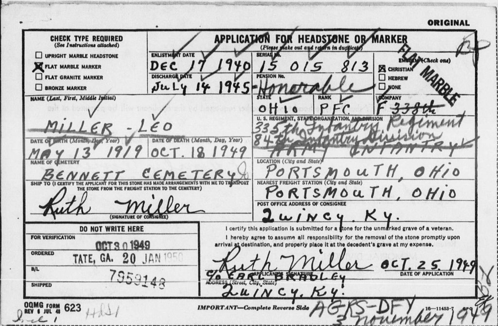 - “United States Headstone Applications for U.S. Military Veterans, 1925-1949,” database with images, FamilySearch (https://familysearch.org/ark:/61903/3:1:3QS7-994Q-B7MQ?cc=1916249&wc=MDBG-5NL%3A205942901%2C213806001 : 26 April 2021), 1941-1949 > Miller, Laurence-Mincher, Paul > image 81 of 2353; citing NARA microfilm publication M1916 (Washington, D.C.: National Archives and Records Administration, n.d.).