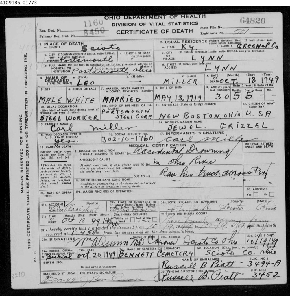 “The victim was identified as Leo Miller, 31, of Tygart road, employee of the Portsmouth Steel Corp. open hearth department.”