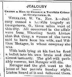 “Wheeling, West Virginia, November 3 – Jealousy caused terrible tragedy at Georgetown, Ohio, three miles west of this city. All concerned in the affair were from Wheeling. Scott Linton1 shot Dot Gray, a woman of the town said to have been his wife, and William Metzger, in whose company she was.”