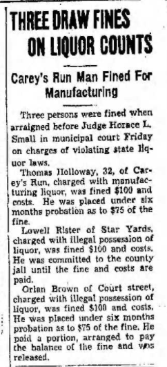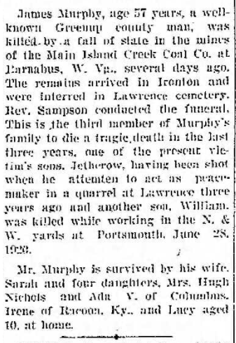 “James Murphy, age 57 years, a well-known Greenup county man, was killed by a fall of slate in the mines of the Main Island Creek Coal Company at Barnabus, West Virginia, several days ago. The remains arrived in Ironton and were intrerred in Lawrence cemetery. Reverend Sampson conducted the funeral. This is the third member of Murphy’s family to die a tragic death in the last three years, one of the present victim’s sons, Jethrow, having been shot when he attempted to act as peacemaker in a quarrel at Lawrence three years ago and another son, William, was killed while working in the N&W yards at Portsmouth, June 28, 1920.”