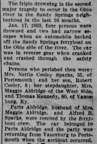 “Paris Aldridge, husband of Mrs. Maggie Aldridge, and Alfred B. Sparks, were rescued by the ferryboat crew. The car belonged to Paris Aldridge and the part was returning from Vanceburg to Portsmouth when the accident occured.”