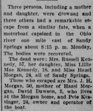 “Three persons, including a mother and daughter, were drowned and three others had a remarkable escape from a similar fate, when a motorboat capsized in the Ohio river one mile east of Sandy Springs about 8:15 PM Monday. The bodies were recovered.”