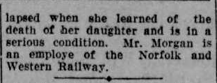 “The mother of Miss Morgan collapsed when she learned of the death of her daughter and is in a serious condition. Mr. Morgan is an employee of the Norfolk and Western Railway.”3
