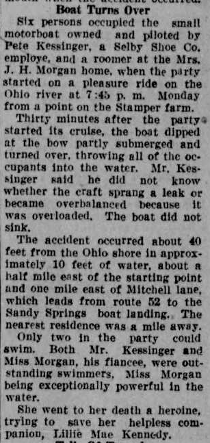 “Six persons occupied the small motorboat owned and piloted by Pete Kessinger, a Selby Shoe Company employee, and a roomer at the Mrs. JH Morgan home, when the party started on a pleasure ride on the Ohio river at 7:45 PM Monday from a point on the Stamper farm.”