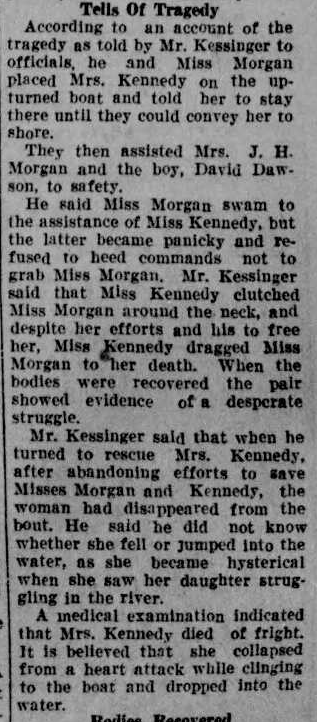 “Mrs. Kessinger said that when he turned to rescue Mrs. Kennedy, after abandoning efforts to save Misses Morgan and Kennedy, the woman had disappeared from the boat. He said he did not know whether she fell or jumped into the water, as she became hysterical when she saw her daughter struggling in the river.”