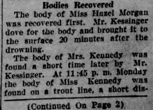 “The body of Miss Hazel Morgan was recovered first. Mr. Kessinger dove for the body and brought it to the surface 20 minutes after the drowning.”