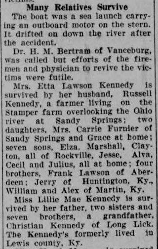 ‘Mrs. Etta Lawson Kennedy is survived by her husband, Russell Kennedy, a farmer living on the Stamper farm overlooking the Ohio river at Sandy Springs; two daughters, Mrs. Carrie Furnier of Sandy springs and Grace at home; seven sons, Elza, Marshall, Clayton, all of Rockville, Jesse, Alva, Cecil, and Julius, all at home; four brothers, Frank Lawson of Aberdeen; Jerry of Huntington, Kentucky, William and Alex of Martin, Kentucky.”