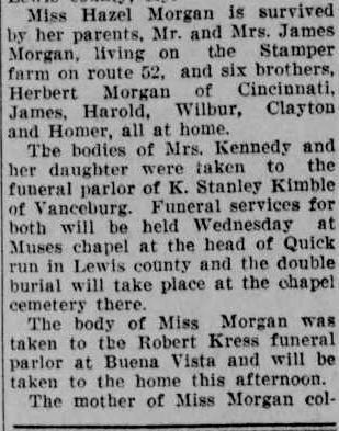 “The bodies of Mrs. Kennedy and her daughter were taken to the funeral parlor of K. Stanley Kimble of Vanceburg. Funeral services for both will be held Wednesday at the Muses chapel at the head of Quick’s Run in Lewis county and the double burial will take place at the chapel cemetery there.”