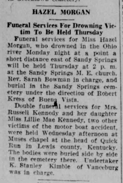 “Funeral services for Miss Hazel Morgan, who drowned in the Ohio river Monday night at a point a short distance east of Sandy Springs will be held thursday at 2 PM at the Sandy Springs ME church. Reverend Sarah Bowman in charge, and burial in the Sandy Springs cemetery under the direction of Robert Kress of Buena Vista.”