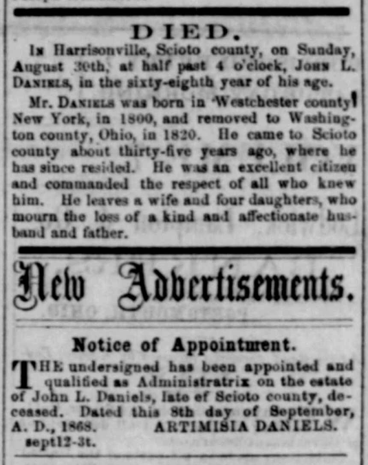 - John L. Daniels obituary and estate notice. (1868, September 12). Portsmouth Times, p. 3.