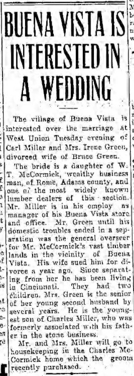 “The village of Buena Vista is interested over the marriage at West Union Tuesday evening of Carl Miller and Mrs. Irene Green, divorced wife of Bruce Green.”