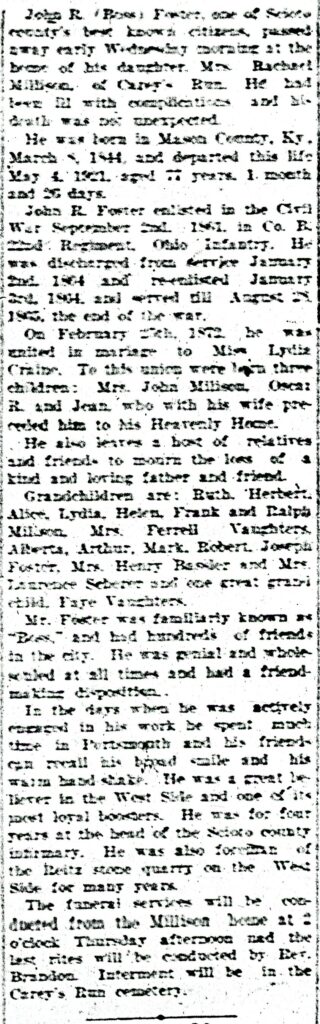 “John R. (Boss) Foster, one of Scioto county’s best known citizens, passed away early Wednesday morning at the home of his daughter, Mrs. Rachel Millison, of Carey’s Run. He had been ill with complications and his death was not unexpected.”