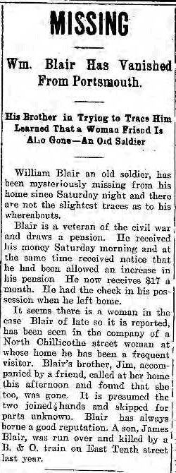 “It seems there is a woman in the case. Blair of late so it is reported, has been seen in the company of a North Chillicothe street woman at whose home he has been a frequent visitor. Blair’s brother, Jim, accompanied by a friend, called at her home this afternoon and found that she was gone, friends and presumed to have gone with Blair. Her present whereabouts are unknown. Blair has always been a good respectable man. A son, James Blair1, was run over and killed by a B. & O. train on East Tenth street last year.”2