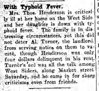 “Mrs. Thomas Henderson is critically ill at her home on the West Side and her daughter is down with typhoid fever. The family is in distressing circumstances, yet this did not deter Al Turner, the landlord, from serving notice on them to vacate, though Henderson was only four dollars delinquent in his rent. Turner’s act was all the talk among West Siders, along Market street Saturday, and he came in for sharp criticism even from friends.”1