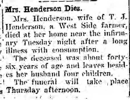 “Mrs. Henderson2, wife of T. J. Henderson, a West Side farmer, died at her home near the infirmary Tuesday night after a long illness with consumption.”