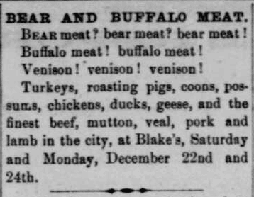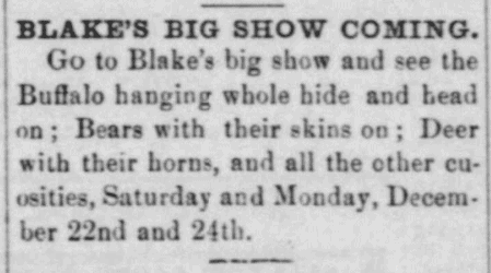 “Go to Blake’s big show and see the Buffalo hanging whole hide and head on; Bears with their skins on; Deer with their horns, and all the other curiosities, Saturday and Monday, December 22nd and 24th.”1