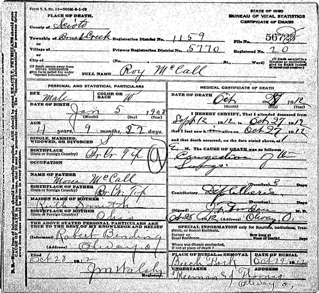 According to his Ohio Certificate of Death, Roy McCall was born January 5, 1908 in Brush Creek Township to Moses McCall and Ruth Smith. He died October 28, 1912, at just four years old, from lung congestion caused by diphtheria, a common and often fatal illness among children in the early 20th century.