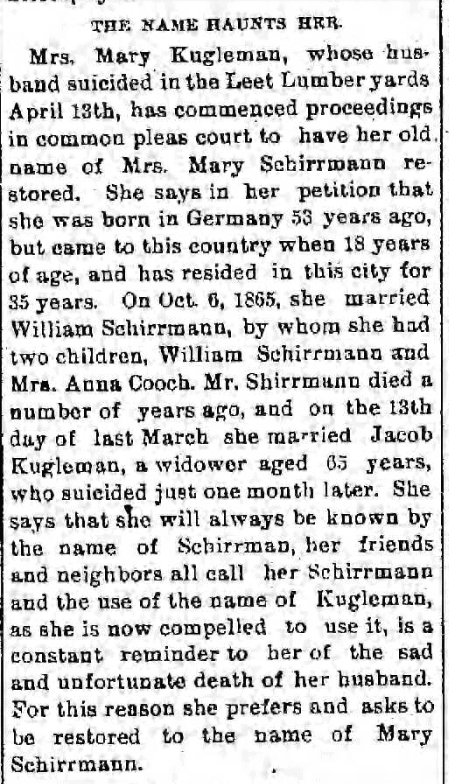 Mrs. Mary Kugelman, whose husband suicided in the Leet Lumber yards April 13th, has commenced proceedings in common pleas court to have her old name of Mrs. Mary Schirrmann restored. She says in her petition that she was born in Germany 53 years ago, but came to this country when 18 years of age, and has resided in this city for 35 years. On Oct. 6, 1865, she married William Schirrmann, by whom she had two children, William Schirrmann and Mrs. Anna Cooch. Mr. Schirrmann died a number of years ago, and on the 13th day of last March she married Jacob Kugelman, a widower aged 65 years, who suicided just one month later. She says that she will always be known by the name of Schirrmann, her friends and neighbors all call her Schirrmann and the use of the name of Kugelman, as she is now compelled to use it, is a constant reminder to her of the sad and unfortunate death of her husband. For this reason she prefers and asks to be restored to the name of Mary Schirrmann.”1