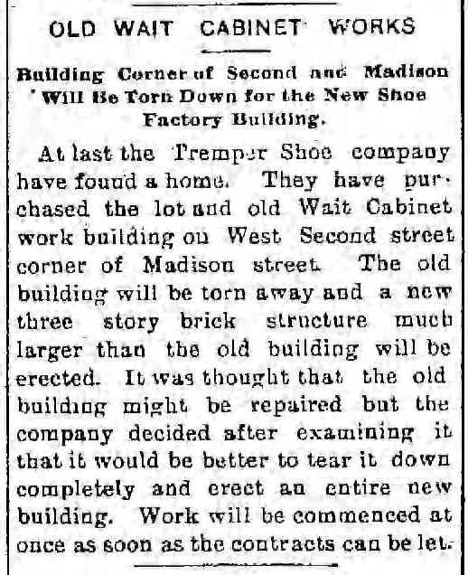 “At last the Tremper Shoe company have found a home. They have purchased the lot and old Wait Cabinet work building on West Second street corner of Madison street. The old building will be torn away and a new three story brick structure much larger than the old building will be erected. It was thought that the old building might be repaired but the company decided after examining it that it would be better to tear it down completely and erect an entire new building. Work will be commenced at once as soon as the contracts can be let.”1