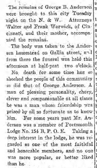 “The remains of George B. Anderson were brought to this city Tuesday night on the N. & W. Attorneys Walter and Frank Warwick, of Cincinnati, and their mother, accompanied the remains.”