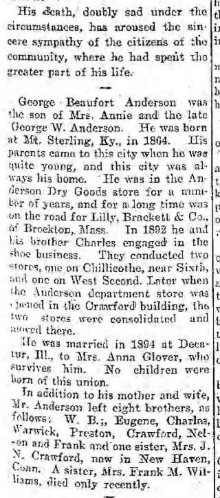 “George Beaufort Anderson was the son of Mrs. Annie and the late George W. Anderson. He was born at Mt. Sterling, Kentucky., in 1864. His parents came to this city when he was quite young, and this city was always his home. He was in the Anderson Dry Goods store for a number of years, and for a long time was on the road for Lilly, Brackett & Co., of Brockton, Mass. In 1892 he and his brother Charles engaged in the shoe business. They conducted two stores, one on Chillicothe near Sixth, and one on West Second. Later, when the Anderson department store was opened in the Crawford building, the two stores were consolidated and moved there.”