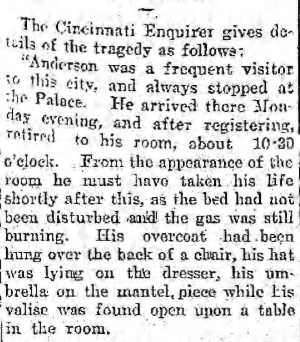 “Anderson was a frequent visitor to this city, and always stopped at the Palace. He arrived there Monday evening, and after registering, retired to his room about 10:30 o’clock. From the appearance of the room he must have taken his life shortly after this, as the bed had not been disturbed and the gas was still burning. His overcoat had been hung over the back of a chair, his hat was lying on the dresser, his umbrella on the mantelpiece, while his valise was found open upon a table in the room.”
