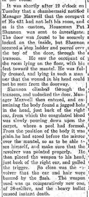 “It was shortly after 12 o’clock on Tuesday that a chambermaid notified Manager Maxwell that the occupant of No. 431 had not left his room, and as is the custom, Houseman Pat Shannon was sent to investigate. The door was found to be securely locked on the inside, but Shannon secured a step ladder and peered over the top of the door, through the transom. He saw the occupant of the room lying on the floor, with his feet toward the mantel. He was fully dressed and lying in such a manner that the wound in his head could not be seen from the doorway.”