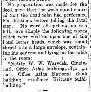 “Notify W. W. Warwick, Cincinnati. Office Atlas Building; Cincinnati Office Atlas National Bank Building; residence Brittany Building.”