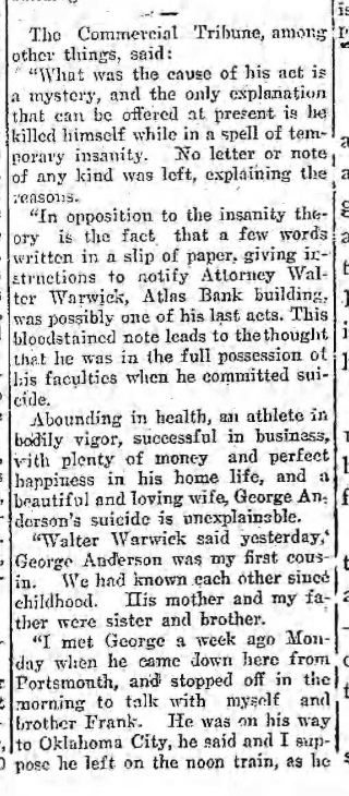““In opposition to the insanity theory is the fact that a few words written in a slip of paper giving instructions to notify Attorney Walter Warwick, Atlas Bank building, was possibly one of his last acts. This bloodstained note leads to the thought that he was in the full possession of his faculties when he committed suicide.””