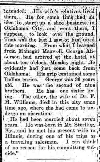 “His wife’s relatives lived there. He for some time had an idea to start up a shoe business in Oklahoma City, and went there, I suppose, to look over the ground. That was the last I saw of him until this morning. From what I learned from Manager Maxwell, George Anderson had arrived at the hotel at about ten o’clock Monday night. He evidently had just come back from Oklahoma. His grip contained some Indian curios. George was 36 years old. He was the second of nine brothers. He has one sister living. The other, the wife of Dr. F. M. Williams, died in this city some time ago, where she had come to undergo an operation.”