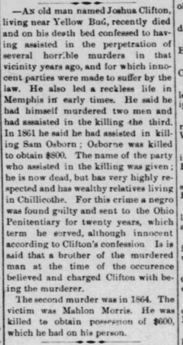 “An old man named Joshua Clifton, living near Yellow Bud, recently died and on his death bed confessed to having assisted in the perpetration of several horrible murders in that vicinity years ago, and for which innocent parties were made to suffer by the law. He also led a reckless life in Memphis in early times. He said he had himself murdered two men and had assisted in the killing the third. In 1861 he said he had assisted in killing Sam Osborn; Osborn was killed to obtain $800. The name of the party who assisted in the killing was given; he is now dead, but has very highly respected and has wealthy relatives living in Chillicothe. For this crime a negro was found guilty and sent to the Ohio Penitentiary for twenty years, which term he served, although innocent according to Clifton’s confession. It is said that a brother of the murdered man at the time of the occurrence believed and charged Clifton with being the murderer.”