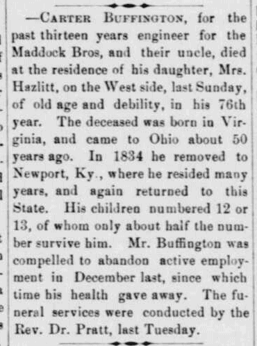 “Carter Buffington, for the past thirteen years engineer for the Maddock Brothers1, and their uncle, died at the residence of his daughter, Mrs. Hazlitt2, on the West side, last Sunday, of old age and debility, in his 76th year. The deceased was born in Virginia, and came to Ohio about 50 years ago. In 1834 he removed to Newport, Kentucky., where he resided many years, and again returned to this State. His children numbered 12 or 13, of whom only about half the number survive him. Mr. Buffington was compelled to abandon active employment in December last, since which time his health gave away. The funeral services were conducted by the Reverend Dr. Pratt, last Tuesday.”3